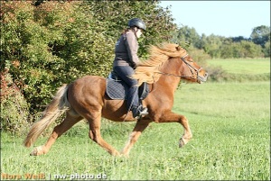 Vinur ist ein Fünfgänger und dank seiner hochgeprüften Eltern mit sehr viel Gangpotential ausgestattet. Der Schritt ist unglaublich weit ausgreifend, man kann fast vergessen, dass man auf einem Pony sitzt. Der Trab ist elegant und schwebend, aber nicht sein Lieblingsgang. Den Tölt mag er am liebsten, meistens taktklar, flott und leichtfüßig. Der Galopp ist auf dem Platz sein Schwachpunkt und eher flach und gelaufen. Der Rennpass ist inzwischen auf Stimmkommando abrufbar und blitzschnell.